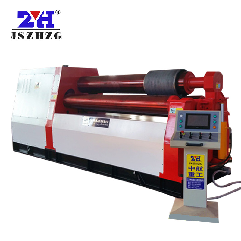 上輥位置固定不動,下輥向上直線運(yùn)動夾緊鋼板。兩側(cè)輥直線或弧線向上輥靠攏運(yùn)動來調(diào)整卷筒的曲率半徑。四輥和三輥卷板機(jī)的輥子運(yùn)動形式不同,但工作原理都一樣,都是利用三點定圓的原理來進(jìn)行不同半徑的卷制。但四輥卷板機(jī)預(yù)彎的直邊和校圓的圓度都要比三輥好。